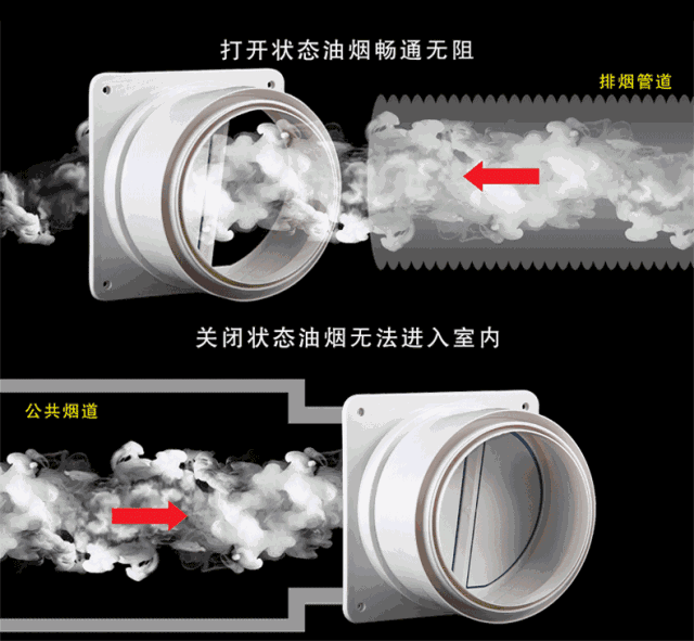 将排烟管一头插入止回阀出风口内外圈之间槽口,用螺钉紧固。另一头直接通过预留孔伸入室外。如排烟管是通入公用烟道,一定要用公用烟道防回烟止回阀连接,并密封好。若排烟到墙外,则建议在排烟管外装上百叶窗,避免回灌。